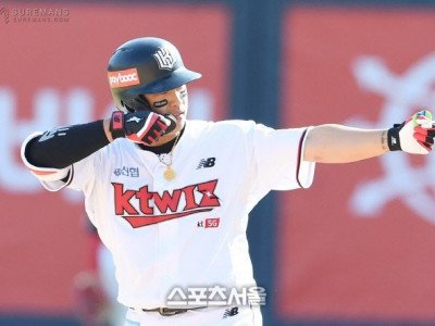 KT 강백호(오른쪽)가 2일 수원 KT위즈파크에서 열린 2021 KBO리그 KT와 KIA의 경기 6회말 1사 2, 3루 상황에서 KIA 투수 김현수를 상대로 2타점 2루타를 치고 세리머니를 하고 있다. 2021. 5. 2. 수원 | 박진업기자 upandup@sportsseul.com[수원=스포츠서울 남서영기자]보직 변경 2년 차를 맞은 KT 강백호가 안정적…