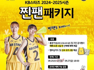 [스포츠서울 | 이웅희 기자] 청주 KB국민은행 스타즈가 오는 25일부터 27일까지 다양한 혜택이 주어지는 2024-2025시즌 ‘찐팬패키지’ 멤버십 회원을 모집한다.‘찐팬패키지’는 홈경기 입장권을 하루 먼저 예매할 수 있는 선예매 혜택과 연고지 가맹점(KB스타즈샵) 할인 혜택 등이 포함된 KB스타즈의 시즌 멤버십 프로그램이다. 지난 시즌에는 판매 개시 1…