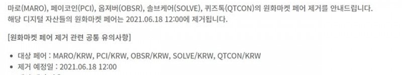 업비트가 오는 18일부터 5개 종목의 코인을 원화마켓에서 제외하기로 결정했다. /업비트 홈페이지 갈무리오는 18일 자정 이후 마로·페이코인 등 5개 종목 원화마켓서 제외[더팩트│최…