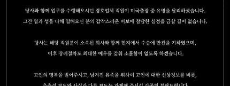 [스포츠서울 | 정하은기자]그룹 몬스타엑스 담당 경호 직원이 미국 현지에서 세상을 떠났다.13일 몬스타엑스 소속사 스타쉽엔터테인먼트는 공식 팬카페를 통해 “가슴 아픈 소식을 전한다. 당사와 함께 업무를 수행해 오시던 경호업체 직원이 미국 출장 중 유명을 달리했다”라고 밝혔다.소속사 측은 “해당 직원이 소속된 회사와 함께 현지에서 수습에 만전을 기했다”며 “…