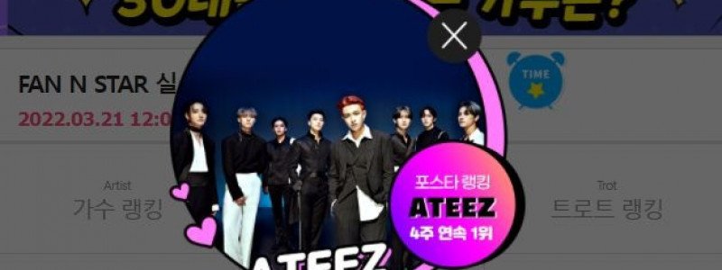 '팬앤스타' 3월 셋째 주 포스타랭킹 투표에서 42만 8538표 득표지난 21일 그룹 에이티즈가 '팬앤스타' 포스타 랭킹 1위를 차지했다. /팬앤스타[더팩트 | 이나래 기자] 그룹 에이티즈가 팬앤스타 포스타랭킹 4주 연속 1위에 올랐다.에이티즈는 지난 14일부터 21일까지 진행된 '팬앤스타' 3월 셋째 주 포스타랭킹 투표에서 42만 8538표를 얻으며 1위…